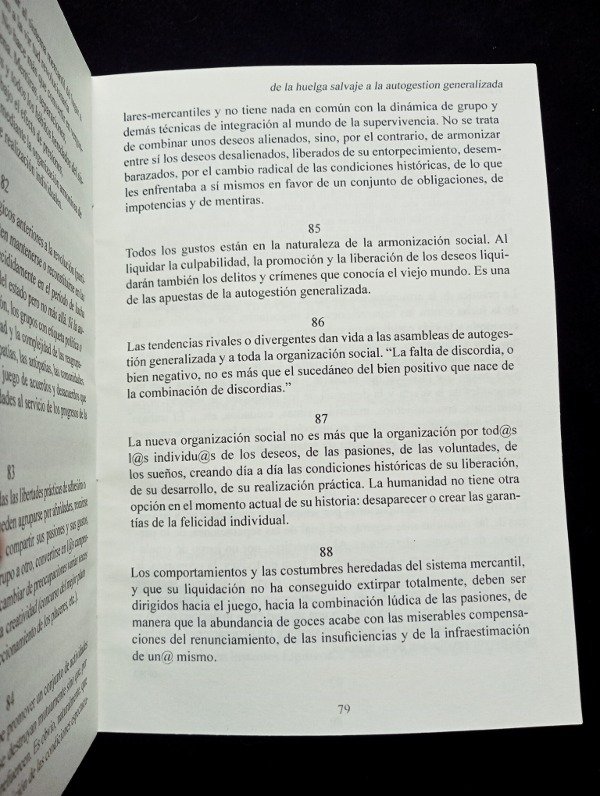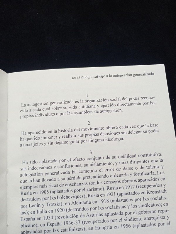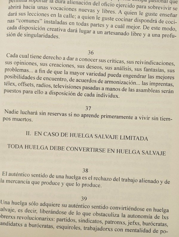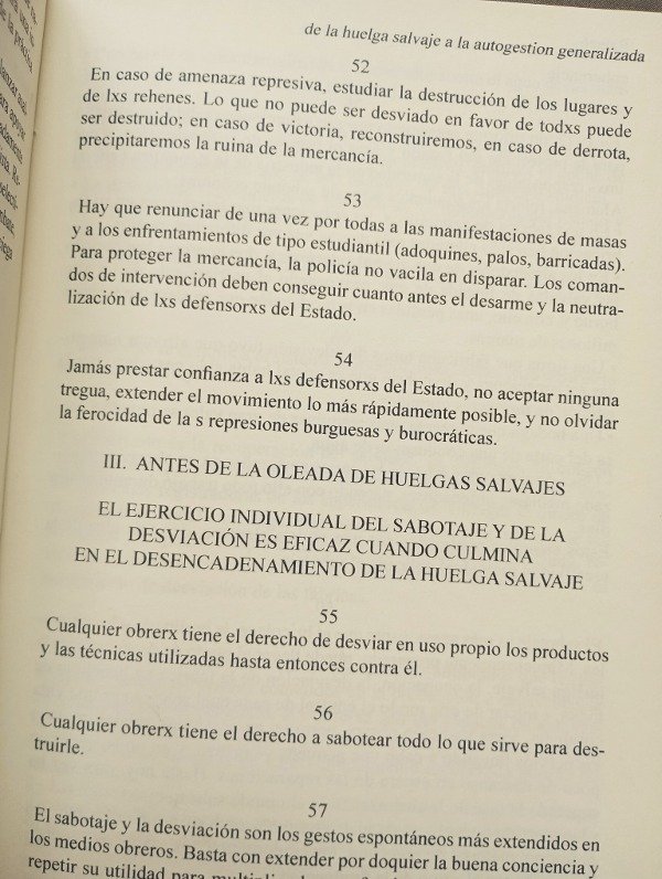 ➤ En De la huelga salvaje a la autogestion generalizada, Raoul Vaneighem nos imprime el espiritu de la Italia Autonomista de los 70´s donde se multiplicaban las acciones colectivas entorno a autorreducciones, huelgas, ocupaciones, protestas e intervenciones. Alli, estudiantes, trabajadorxs y vecinxs optaron por organizarse y actuar sin necesidad de dirigentes ni partidos ni un nombre único que les identifique.