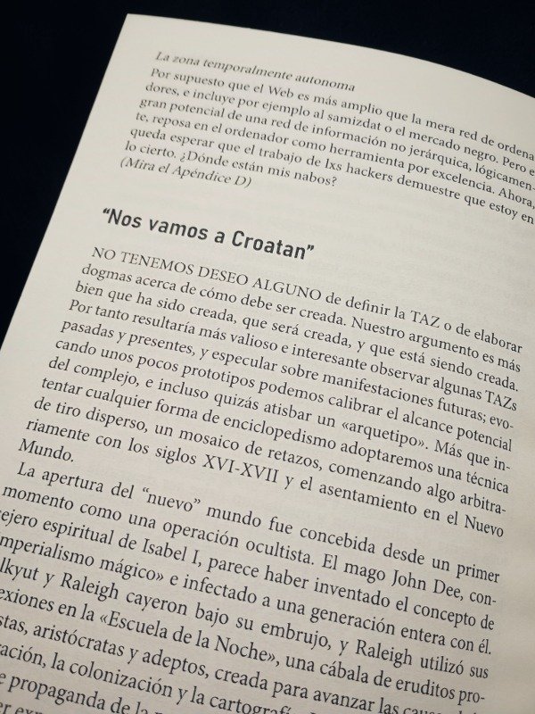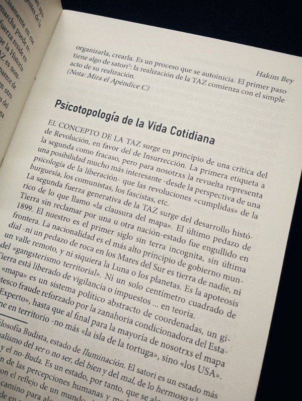 ➤ Zona temporalmente autónoma, en su original en inglés Temporary Autonomous Zone (TAZ), es un ensayo publicado en 1991 que despliega tácticas para crear espacios temporales que eludan las estructuras formales de control social.