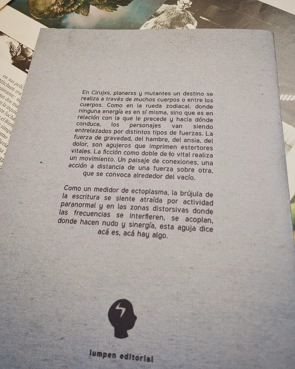 જ⁀➴ En Cirujxs, planerxs y mutantes un destino común se realiza a través de muchos cuerpos o máscaras. Como en la rueda zodiacal, los personajes van siendo entrelazados por distintos tipos de fuerzas. La ficción como doble de lo vital realiza un movimiento. Un paisaje de conexiones, una acción a distancia de una fuerza sobre otra, que se convocan alrededor del vacío. Como un medidor de ectoplasma, la brújula de la escritura se siente atraída por actividad paranormal y en las zonas distorsivas donde las frecuencias se interfieren, se acoplan, donde hacen nudo y sinergía, esta aguja encuentra: acá es ⋆✴︎˚。⋆