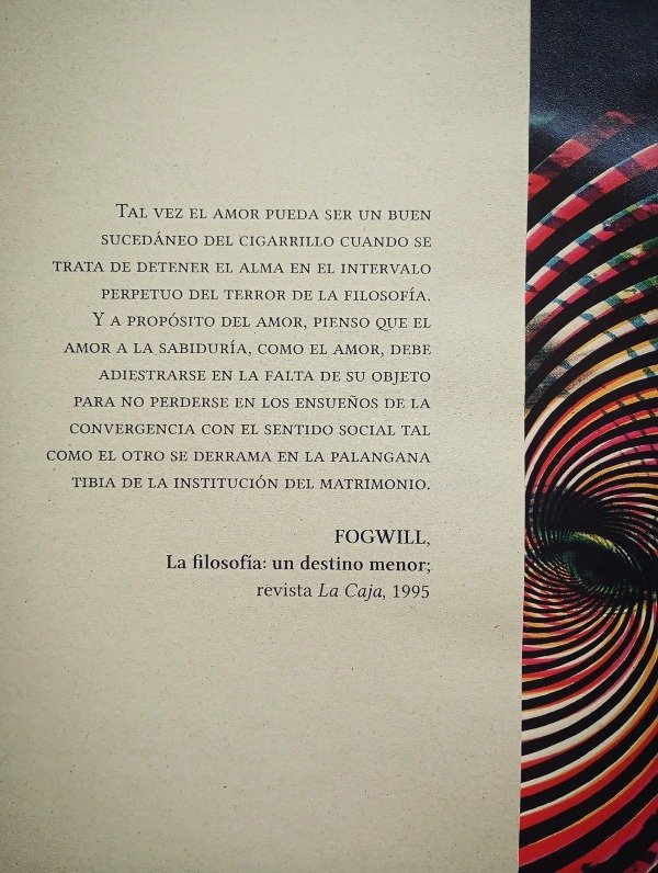 ➤ Este rítmico, apabullante, intoxicado, pornográfico y psicodélico relato de Fowgill aparece publicado por primera vez en el libro Pájaros de la cabeza, editado por Catálogos en 1985.