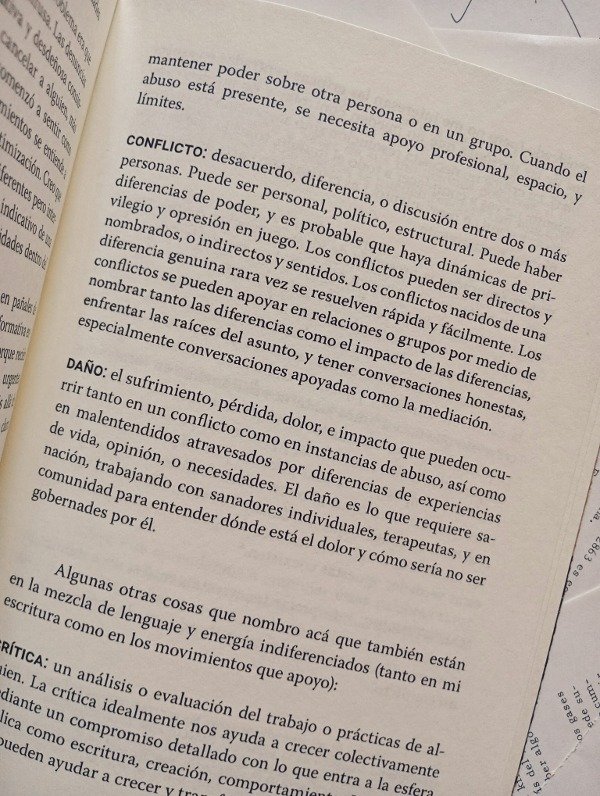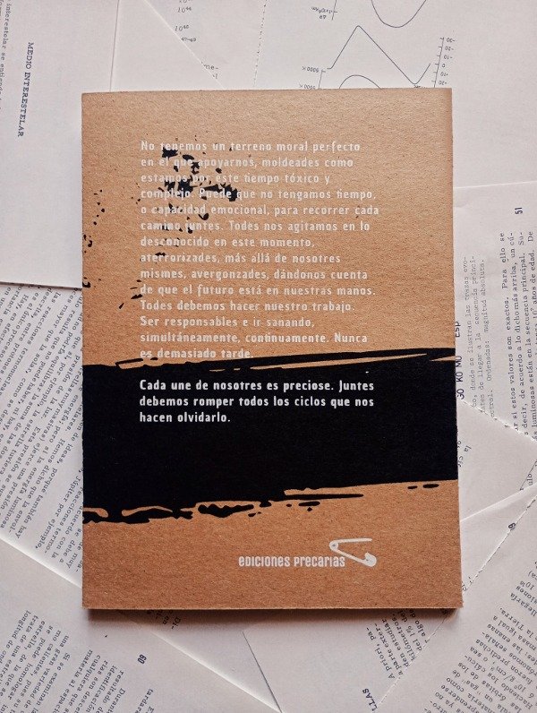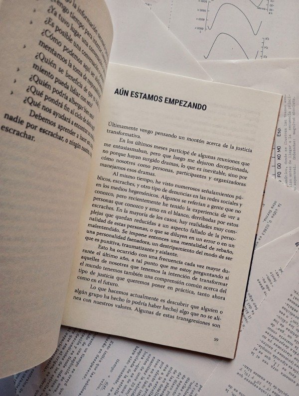 No tenemos un terreno moral perfecto en el que apoyarnos, moldeades como estamos por este tiempo tóxico y complejo. Puede que no tengamos tiempo, o capacidad emocional, para recorrer cada camino juntes. Todes nos agitamos en lo desconocido en este momento, aterrorizades, más allá de nosotres mismes, avergonzades, dándonos cuenta de que el futuro está en nuestras manos. Todes debemos hacer nuestro trabajo. Ser responsables e ir sanando, simultáneamente, continuamente. Nunca es demasiado tarde.